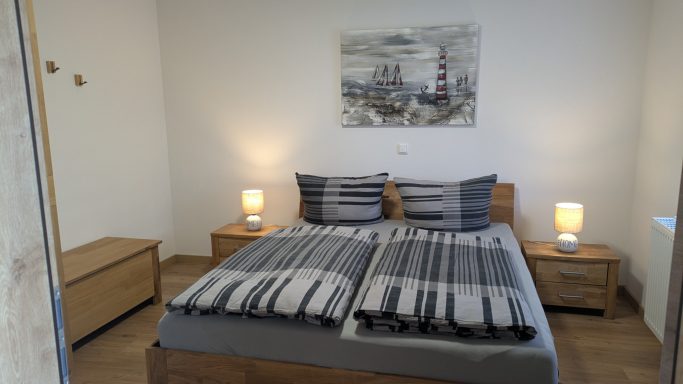 Das Schlafzimmer in unserer Ferienwohnung ist mit einem gemütlichen Doppelbett ausgestattet, das für erholsame Nächte sorgt. Die stilvolle Einrichtung schafft eine angenehme Atmosphäre, in der man sich sofort wohlfühlt. Ein großer Kleiderschrank bietet ausreichend Stauraum für Ihre Kleidung und Gepäck. Das Fenster lässt viel Tageslicht herein und kann mit einem Rolladen verdunkelt werden . Genießen Sie die Ruhe und Entspannung im Schlafzimmer während Ihres Aufenthalts in unserer Ferienwohnung.