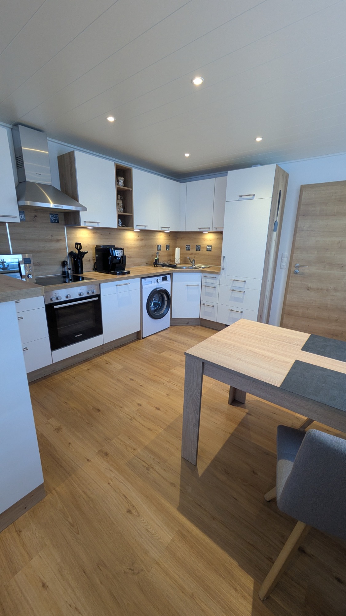 Im Küchenteil eine Kaffeemaschine, Kaffeevollautomat sowie eine Senseo, Wasserkocher, Toaster, Eierkocher, Mikrowelle, 4-Platten-Herd mit Backofen, Waschmaschine, Spülmaschine, etc,